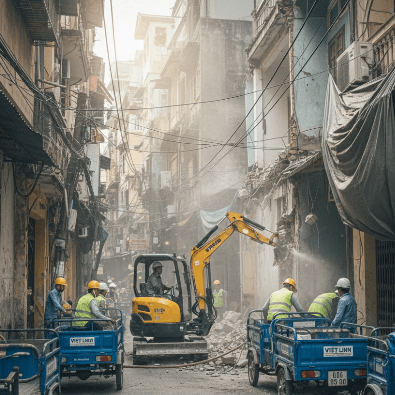 Đừng để những con ngõ nhỏ hay nỗi lo về vận chuyển phế thải cản trở tiến độ của bạn. Công ty Xây dựng Việt Linh mang đến giải pháp phá dỡ công trình, đào móng tại Hoàn Kiếm chuyên nghiệp, cam kết thi công nhanh gọn ngay cả trong những địa hình "hiểm hóc" nhất.