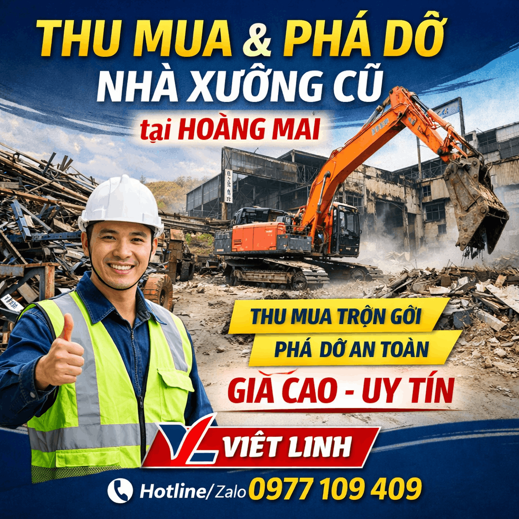 Với nhiều năm kinh nghiệm trong lĩnh vực thu mua phế liệu công trình và phá dỡ nhà xưởng, Việt Linh tự hào là đơn vị cung cấp dịch vụ Thu mua & phá dỡ nhà xưởng cũ tại Hoàng Mai chuyên nghiệp, minh bạch và hiệu quả.